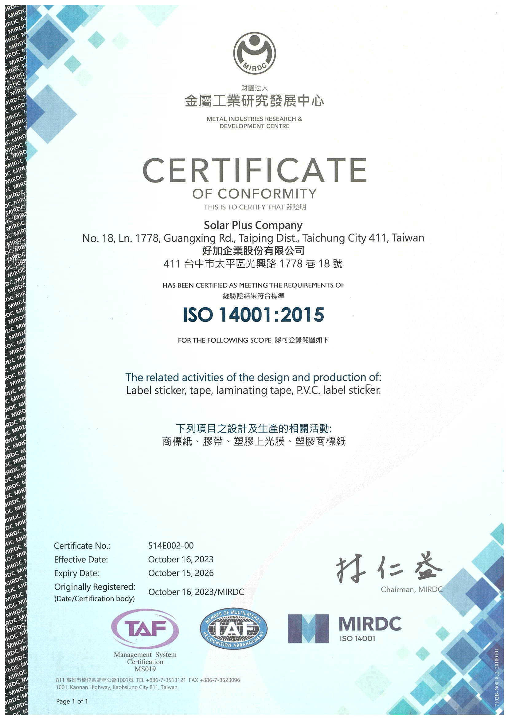Solar Plus Company ISO 9001, ISO 45001, ISO 14001, ISO14064-1, Certificate
