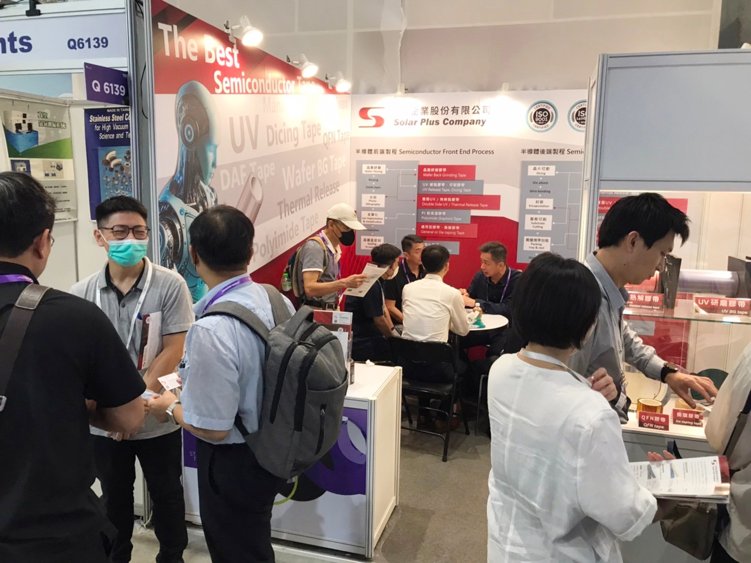 Solar plus company also participated in this exhibition in the application materials section at the Nangang Exhibition Center Hall 2. We showcased our latest semiconductor tape products, including UV release grinding tapes, dicing tapes, thermal release tapes, and various heat-resistant packaging tapes. The main theme of our booth was designed to clearly demonstrate the semiconductor manufacturing process and the corresponding tapes that can be used, allowing attendees to understand the wide variety of innovative tapes available for semiconductor processes.